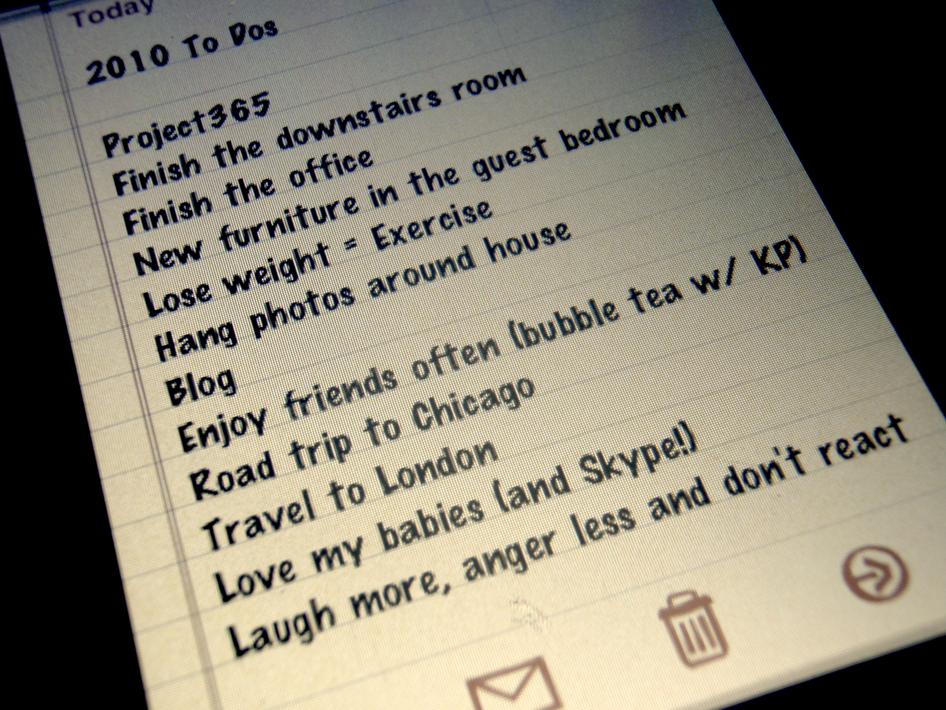 As a part of today, I was inspired by what the year can hold for possibility. And so I started writing my NY Resolutions. And I kept writing… And I kept adding. And eventually, I realized I had a to do list. I don’t want to try to do something; I want to do it. So, here you see my to do list for 2010. Help me maintain… Whether it’s doing this blog or letting me know that I am reacting…