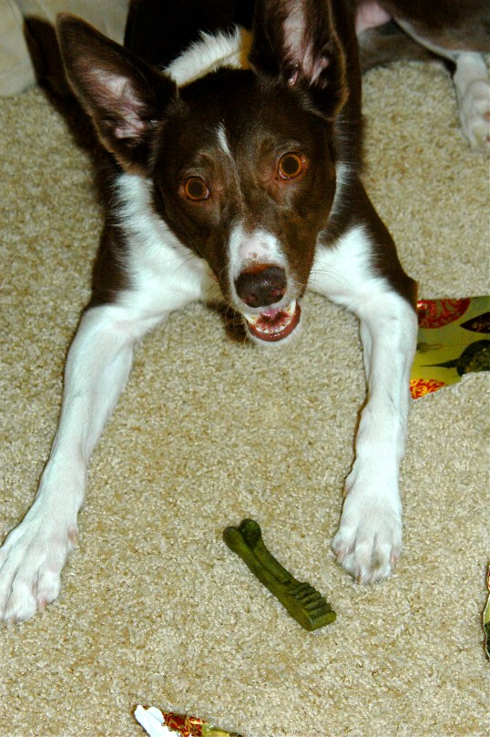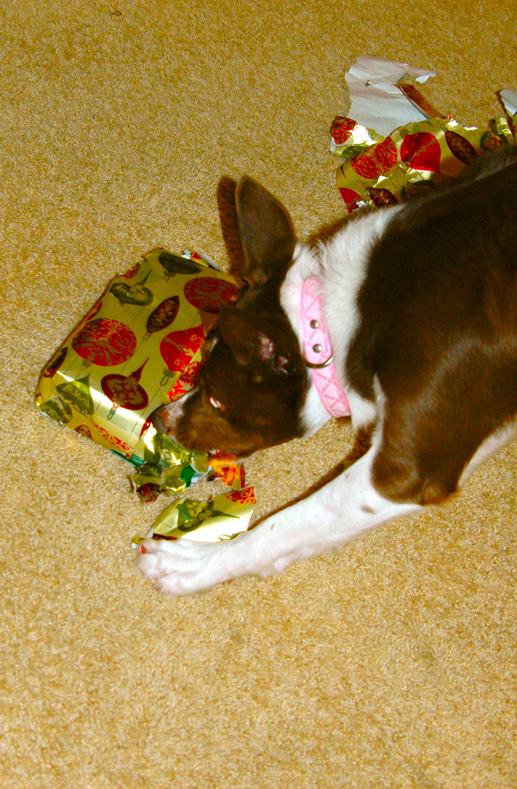 So, our favorite visiting friend, Bailey the Dog, came over tonight. We had saved some Christmas presents for her to open after hearing of her major feats over the Holiday. Much to our delight, she was able to open our two gifts! She holds down the item with her paws and then rips into the packaging with her teeth. She LOVES opening the gifts!