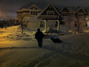 Well, we’re getting another 6-10 inches of snow today. Yuck. It was supposed to start at 12 pm and last until 6 or 7. It started at 9:30 and is still coming down as I type at 10 pm. Either way, we had fun and took Diohgé outside to run around for a bit. Not the best picture I’ve taken, but he was all the way in the snow and often had to “buck” his way out. Hilarious.