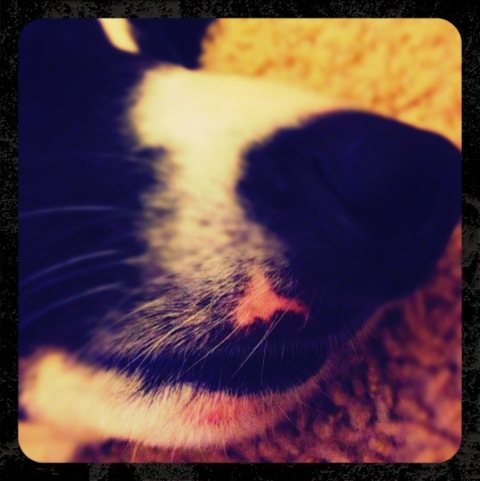 Dave took him to the vet today and he’s on an antibiotic. He’s pretty tired right now. Which is perfect for snuggle time! I love those pink lips.