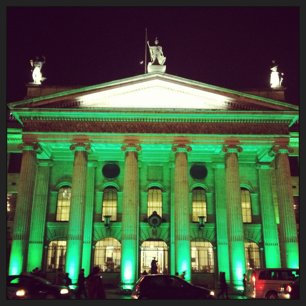 Here’s a photo of the Greening of the city where all major buildings are colored green for the weekend. 🙂