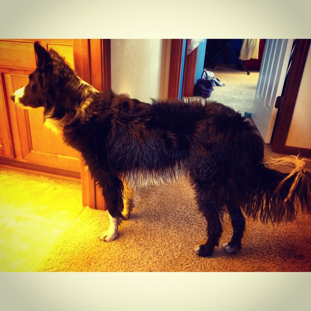 The dog park has been awfully muddy these past few days as the snow is melting. We needed to wash down the pup tonight as he was spreading mud on the walls. He does NOT like baths. Here’s his look when he heard the bath water turn on… And then he tried to quickly leave.