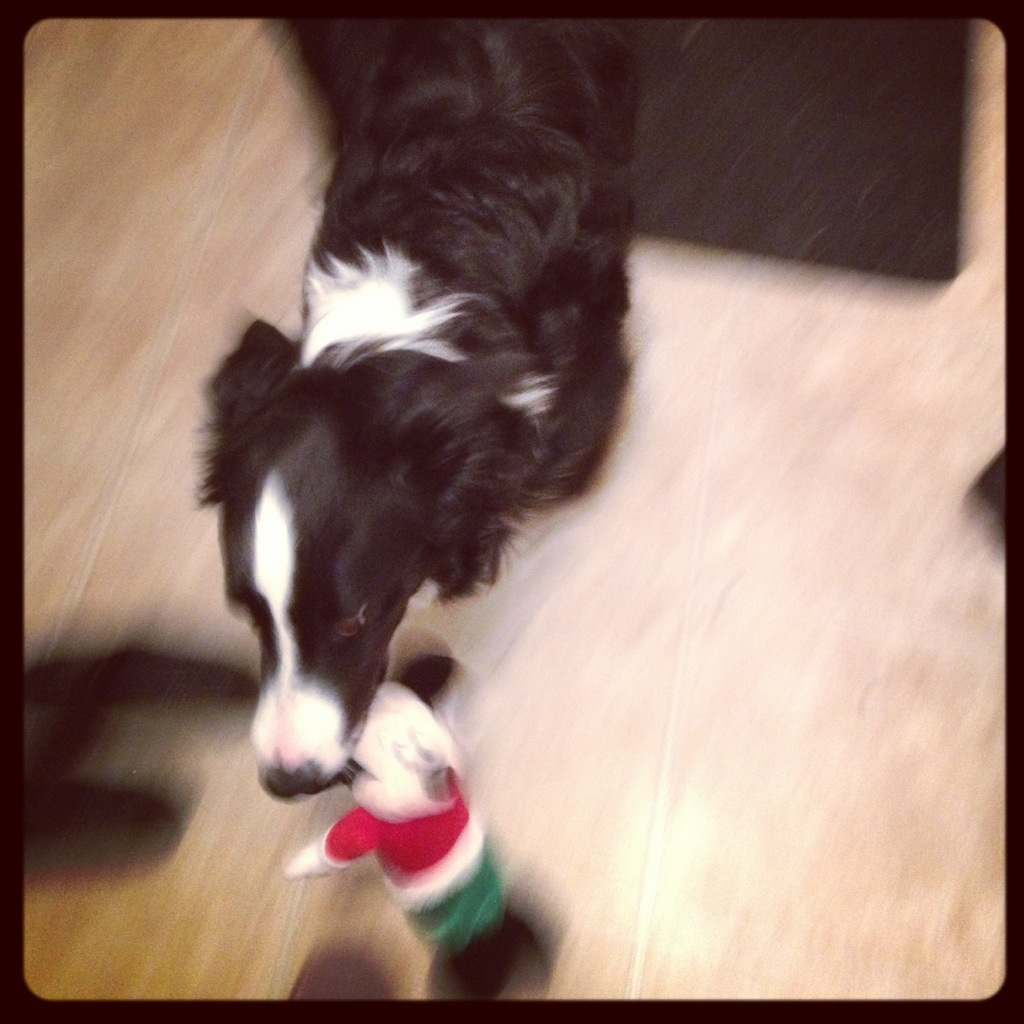 If I squeak the ball or hide it behind my back, he goes crazy… Rushes down the stairs and grabs it. A little video: