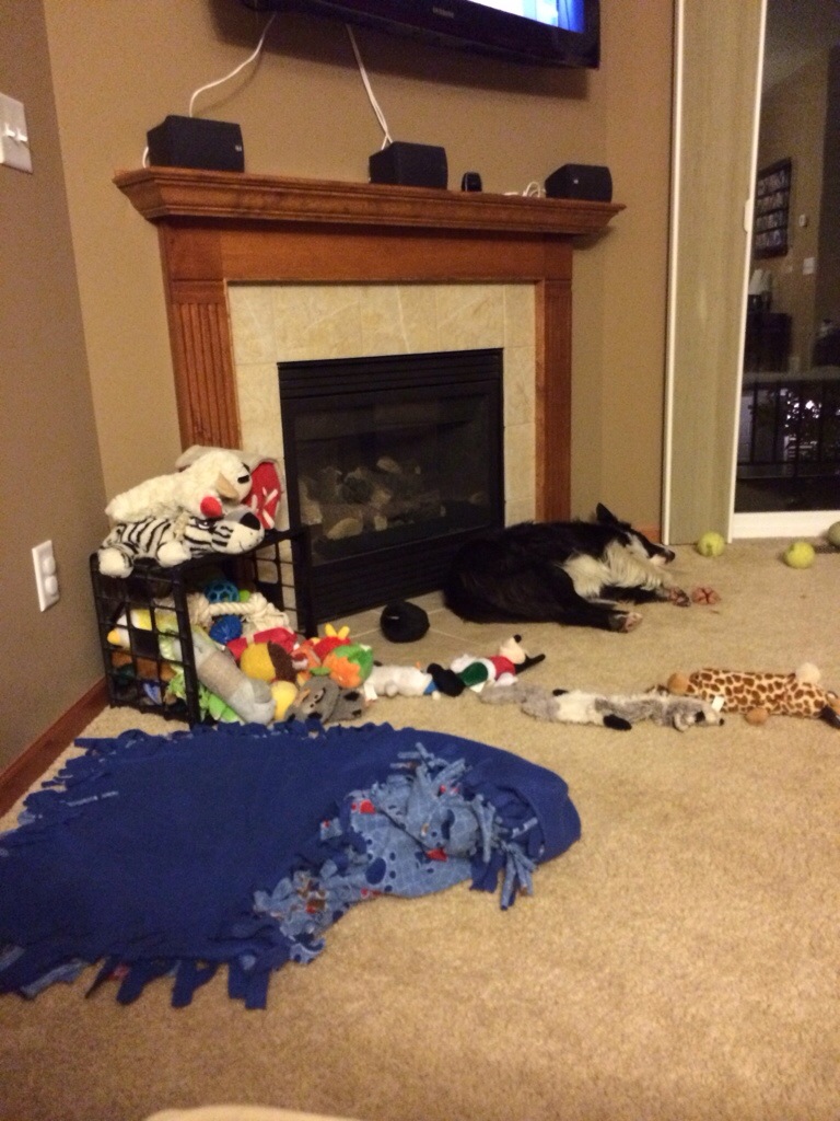 Pooch didn’t find it funny. Nor us continually cleaning up his horde. He just pulls it back out and then falls asleep.