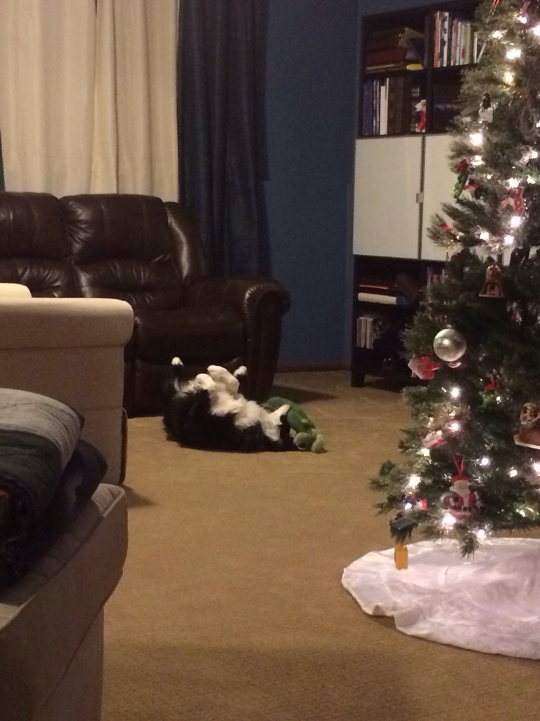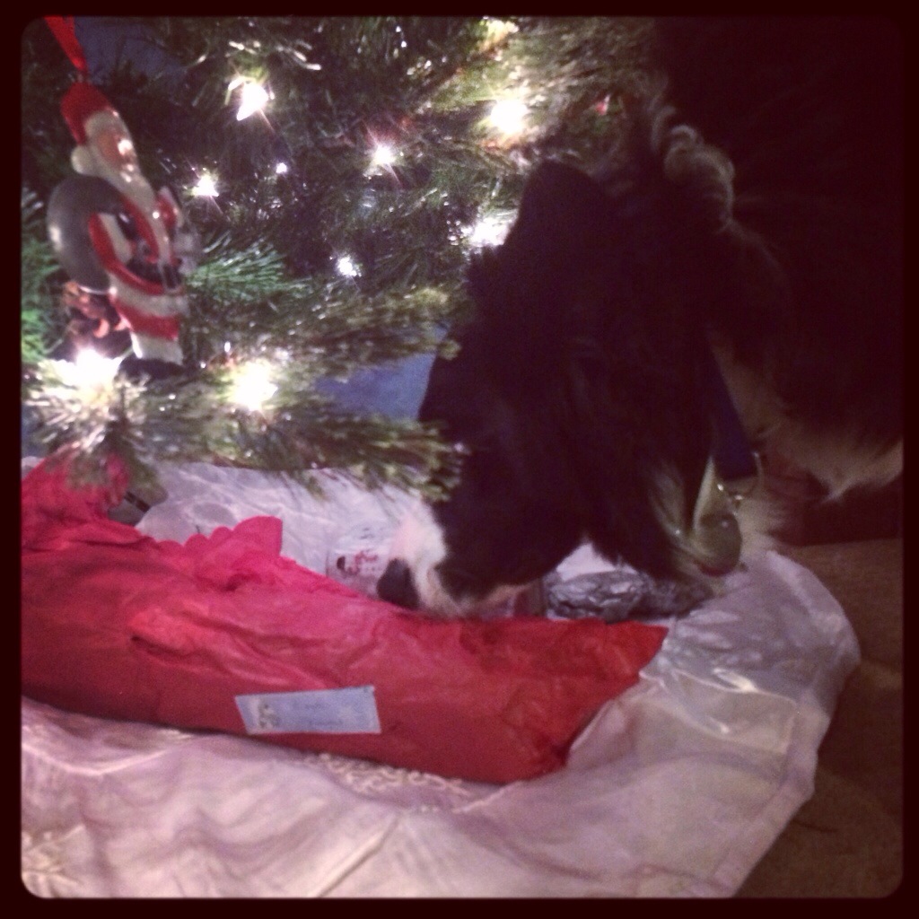 348.365.2013 Presents from Nammie Posted on December 16, 2013 by dtsphoto365 Today we received a box of fun from my mother. I took the presents downstairs to place under the tree for Christmas Day. Diohgé started sniffing and quickly found his gift. So, we let him open it. He was so happy!