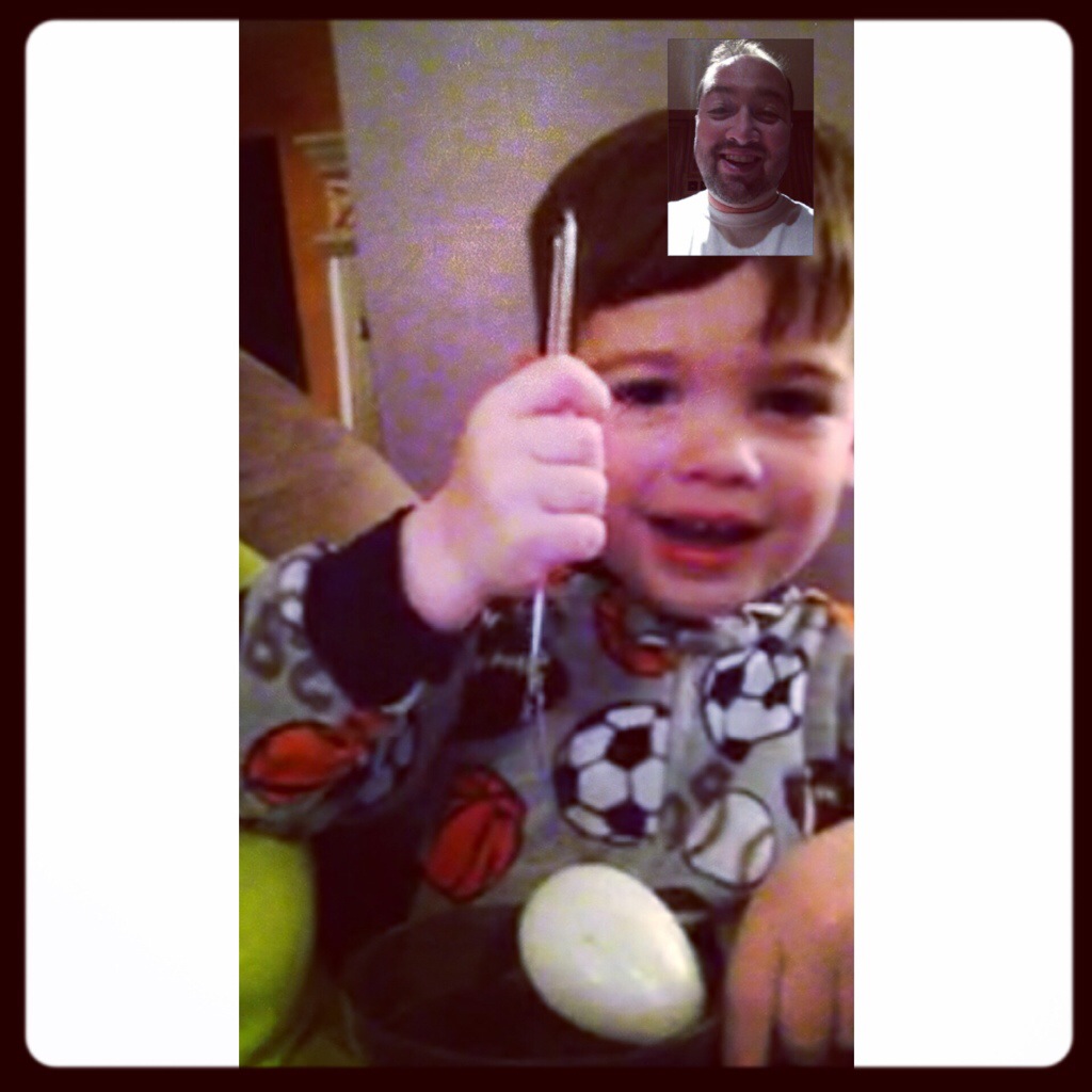 92.365.2014 Max and the Egg Posted on April 2, 2014 by dtsphoto365 I got a FaceTime call from my nephew Max tonight. Apparently he made me an egg and needed to show it to me. Then he discovered Diohgé and it became “Doggy!” He was so cute and fun!