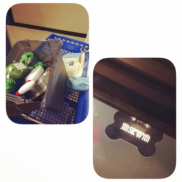 I leave tomorrow AM to spend some time with my bestie. So tonight was my night to nest for the new pup. We headed to the Petsmart to pick up the necessities like bowls, food, a leash, collar and a name tag.