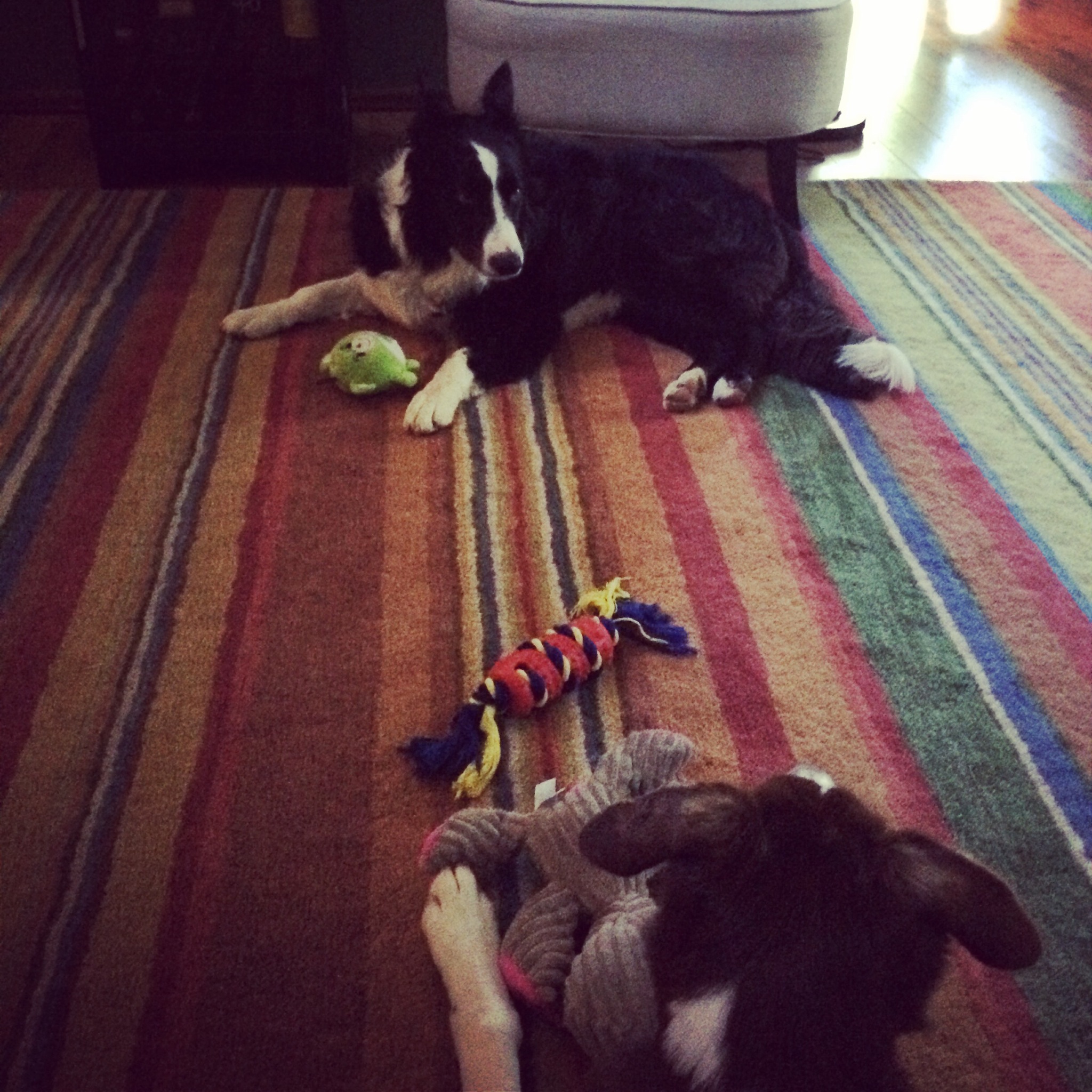 These boys were a lot of fun this morning running around. They eventually got to the point of being on opposite sides of the room with their perspective toys. Territory!