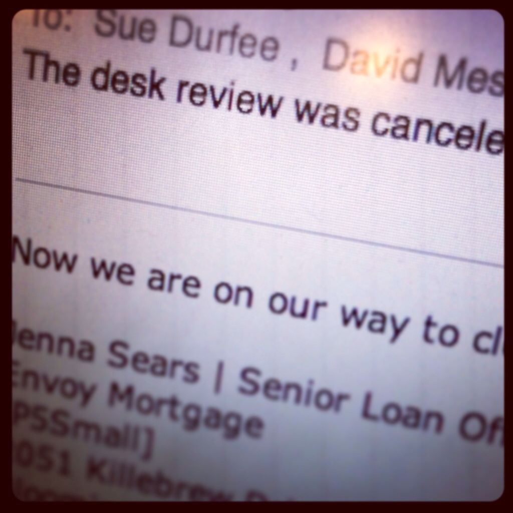 Then this evening we finally got the news we’d been waiting on. Earlier this week, we found out the mortgage underwriter was challenging the appraisal value on our house. Long story short, we could lose the house. BUT, we got the news that the review was cancelled! Woo hoo!