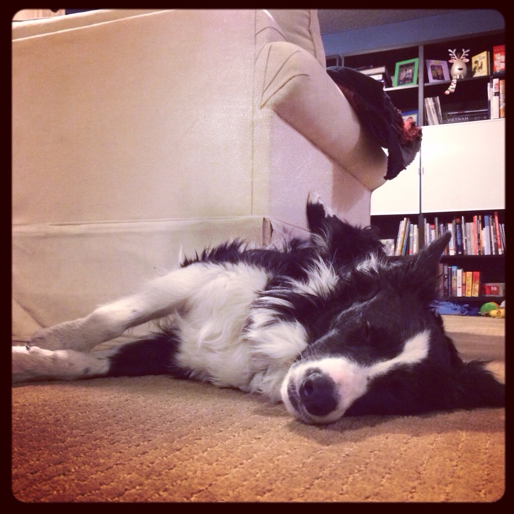The pooch was at their house all day and he is exhausted! He curled right up on Bailey’s blanket and went to sleep.