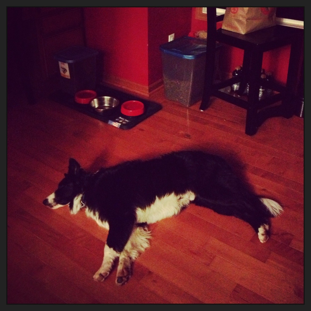 Pooch was tuckered and for some reason, really enjoyed sleeping in the dark kitchen.